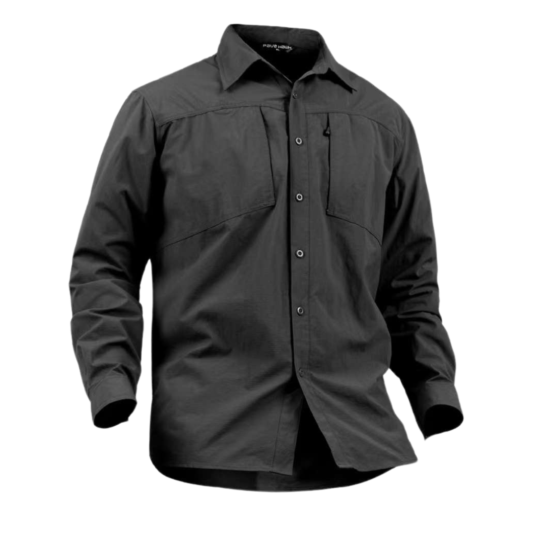 Camisa con bolsillos ocultos, suave al tacto tela delgada en color negro y beige.